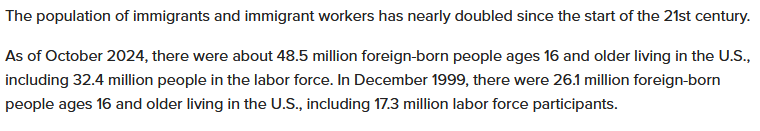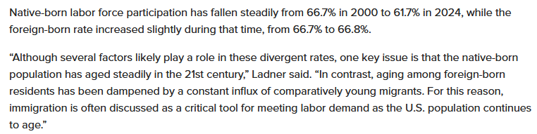 The past larger number of native workers who began work in the 1970s and 1980s (when immigration was low) are aging out of the workforce, while the immigrant workforce is now growing rapidly, resulting in a shift towards a workforce that will increasingly be immigrants versus native workers.