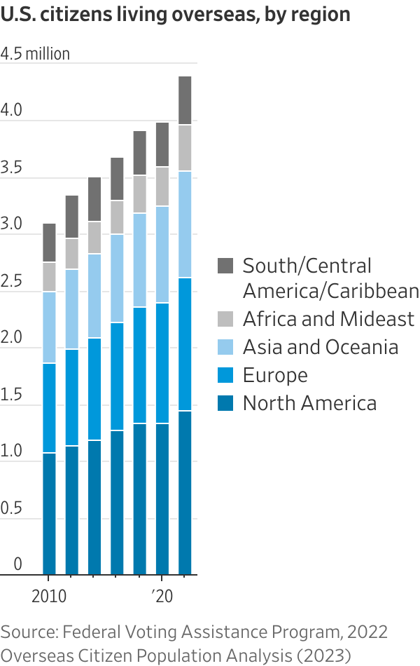 This WSJ article: More Middle-Class Americans Are Living Abroad to Stretch Their Dollars – WSJ (paywall) – and for now also: More Middle-Income Americans Are Trying to Make a New Life Overseas – uses a different estimate of Americans living abroad and arrives at 4.4 million, which is about 1.3% of the U.S. population, which is lower than other estimates of 1.6%, 2%-3%.